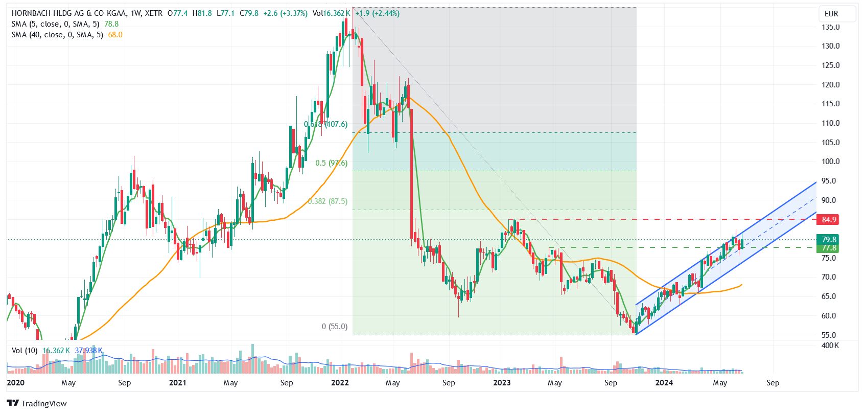 Entgegen dem kontroversen Werbespot, hat der Aufwärtstrend im Wochenchart bei der Hornbach Holding im Einklang mit dem Gesamtmarkt bereits im letzten Herbst begonnen. Nach den aktuellen Quartalszahlen und einem unveränderten Ausblick ist zu beobachten, ob der obere Rand des Aufwärtstrendkanals (€82-€74) weiter ein Widerstand bleibt bzw. der untere eine Unterstützung. Aktuell ist der Kurs erst einmal oben angestoßen.
