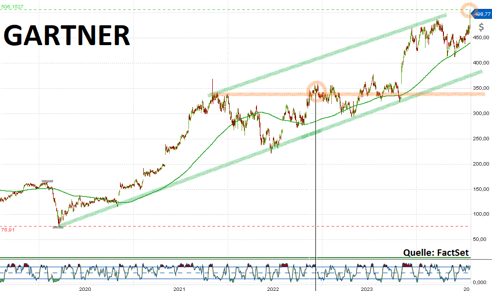 Wer sollte von einem KI-Hype profitieren, wenn nicht die weltweit bekannte Adresse für IT-Research und -Beratung mit Sitz in Stamford, Connecticut. Seit Beginn der aktuellen KI-Welle am 30.11.2022 hat sich die Aktie von GARTNER INC. (NYSE-Kürzel: IT) immerhin um rund 49 % verteuert. Parallel dazu bei ACCENTURE ca. + 11 %. Oder + 116 % für C3.AI (mit größerer Volatilität).
