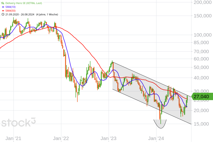 Die Aktie des Betreibers von Online-Bestell- und Lieferplattformen für Mahlzeiten, Lebensmittel und andere Waren des täglichen Bedarfs hat derzeit einen Lauf. Am gestrigen Donnerstag legte der Kurs um 12,2 % auf 26,37 € zu, aber der Kurs befindet sich bereits seit vergangener Woche in der Aufwärtsbewegung. Die erfreuliche Tendenz wurde durch solide Ergebnisse im zweiten Quartal, eine bestätigte Jahresprognose und positive Nachrichten aus dem Korea-Geschäft begünstigt. Analysten sehen die Hauptursache für den Kurssprung jedoch in der Ankündigung eines möglichen Börsengangs des Nahost-Geschäfts, was als unerwarteter Schritt zur Verbesserung der Unternehmensbilanz gewertet wird.