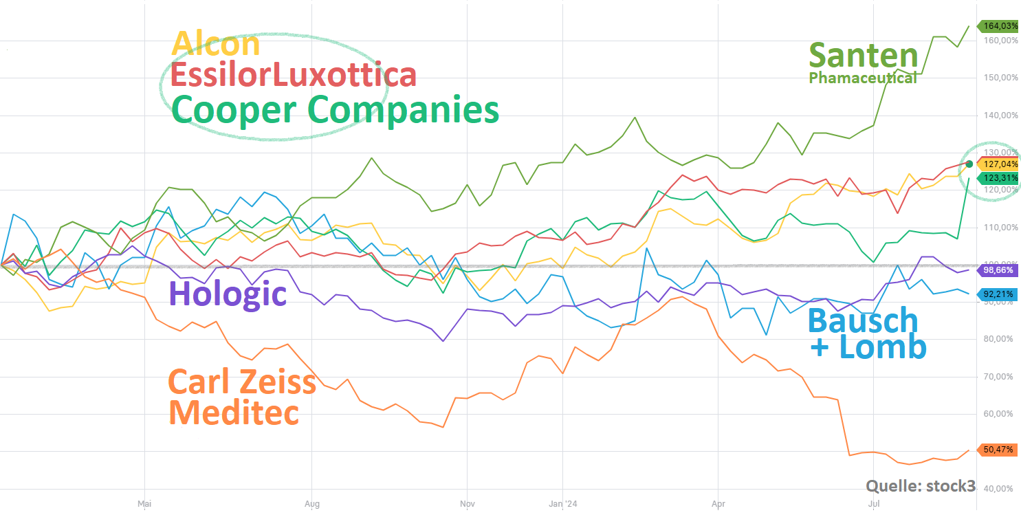 Ein Anhaltspunkt, um "COO" (Nasdaq-Kürzel) einzuordnen, ergibt sich aus den Marktkapitalisierungen einiger Konzerne mit teilweise ähnlichen Aktivitäten. Unsere Auswahl (auch für den dargestellten einjährigen Chartvergleich): In Nordamerika ++ ALCON (41 Mrd. CHF) ++ BAUSCH+LOMB (5,6 Mrd. $) ++ HOLOGIC (19 Mrd. $). In Europa ++ CARL ZEISS MEDITEC (6 Mrd. €) ++ ESSILORLUXOTTICA (98 Mrd. €). Sowie in Japan ++ SANTEN PHARMACEUTICAL (umgechnet 4,5 Mrd. $).