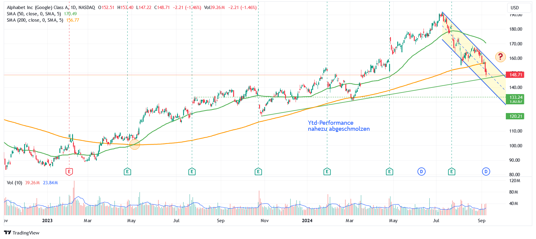 Doch auch wenn juristische Einschläge (EU/USA-Kartellrecht) oftmals Kaufgelegenheiten generieren, so hat sich die charttechnische Situation dadurch keineswegs verbessert; im Gegenteil: der Abwärtstrendkanal ist voll in Takt, der 1Jahresaufwärtstrend in Gefahr und ein Todeskreuz kann auch noch drohen.