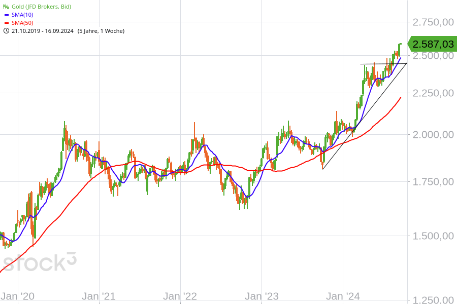 Der Goldpreis erreichte heute mit 2.589,68 $ pro Feinunze (31,1 Gramm) ein neues Allzeithoch. Auch in Euro gerechnet erzielte Gold einen Rekordstand von 2.334,80 € je Unze. Dieser starke Preisanstieg resultiert hauptsächlich aus der Erwartung, dass die US-Notenbank Fed in dieser Woche die erste Zinssenkung seit Beginn der Inflationswelle einleiten wird. Diese Spekulationen wurden durch klare Hinweise aus den Reihen der Fed verstärkt, wobei allerdings unklar bleibt, wie schnell und in welchem Ausmaß weitere Zinsschritte folgen könnten?.