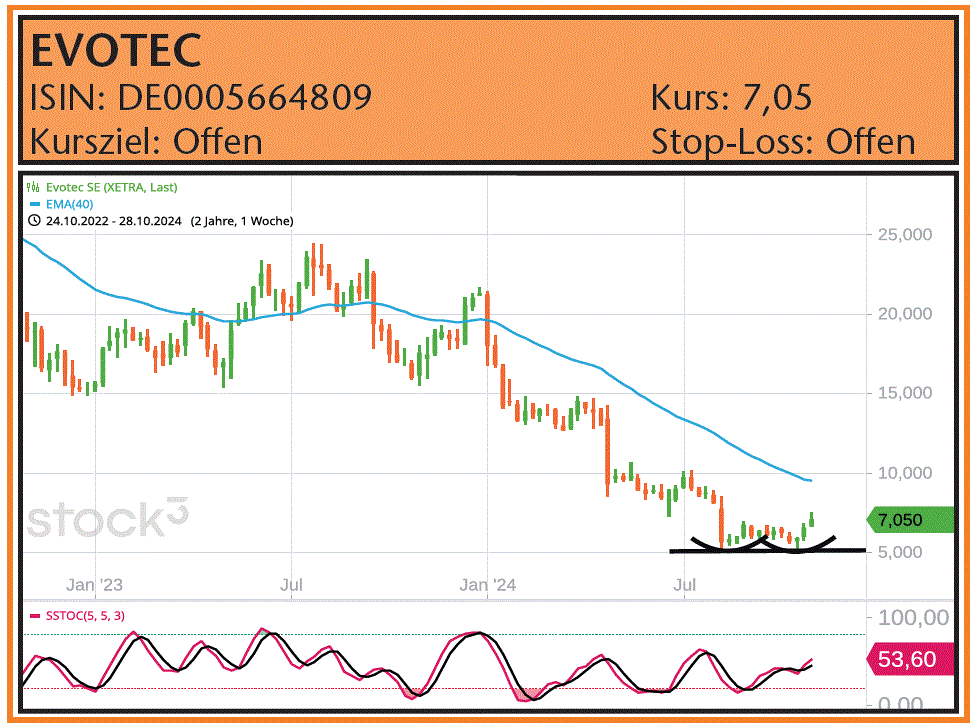 Die Forschung kostet Geld und ein echter Gewinn je Aktie ist vorerst nicht in Sicht. - 0,19 € im kommenden Jahr sind jedoch ein Erfolgserlebnis nach knapp 1 € Verlust vor zwei Jahren. Entscheidend ist jedoch: Wann sind die nächsten Meilenzahlungen fällig und wann kann EVOTEC mit eigenen neuen Produkten dieses Outsourcing fortsetzen oder erhöhen? Darüber gibt es keine klaren Meinungen. Auf der Ebene um 7 € finden hohe Umsätze statt, teilweise über 5 Mio. Stück pro Tag, bei steigender Tendenz des Kurses.