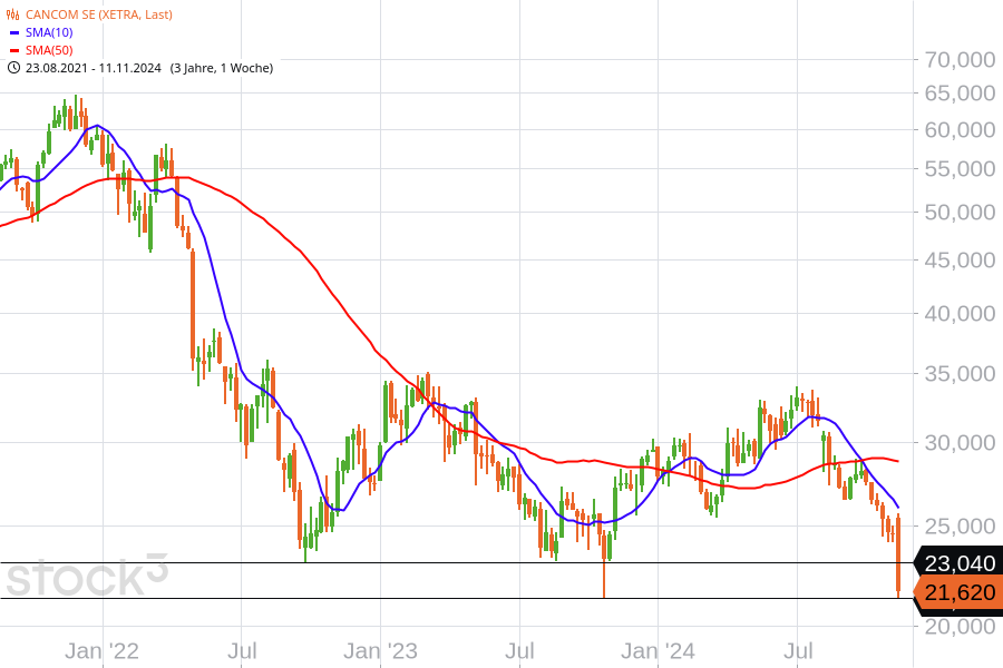 Die Bekanntgabe der Prognosesenkung führte heute zu einem deutlichen Kursrückgang. Im Laufe des Dienstagvormittags fiel der Aktienkurs zeitweise um mehr als 16 % und erreichte mit 21,22 € den tiefsten Stand seit rund einem Jahr. Nun muss sich zeigen, ob das Tief von Oktober 2023 hält, oder ob der Kurs nach unten durchsackt. Das wäre dann ein glasklares chartechnisches Verkaufssignal.