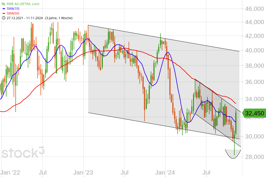 Die Ankündigungen haben heute zu einem Kursgewinn von rund 8 % geführt. Damit hat die Aktie nun gute Chancen, den seit Anfang Juni währenden Abwärtstrend zu überwinden. Der übergeordnete Abwärtstrend, der seit Anfang 2023 intakt ist, wäre davon allerdings unberührt. Dennoch steht die RWE-Aktie kurz davor, ihre charttechnische Verfassung deutlich zu verbessern.