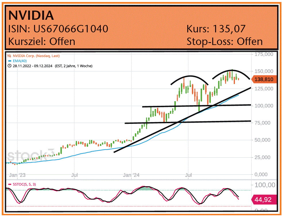 Die zurzeit einmalige Stellung von NVIDIA im KI-Sektor aller Techs hat immer noch Bestand, aber für wie lange? Die Arbeiten der Konkurrenz werden hinreichend diskutiert. China startet soeben mit einer Antitrust-Klage, deren Ausgang offen ist. Wir hatten eine Doppelspitze bei rd. 140 $ bereits diskutiert. Sie wurde zeitweise geringfügig überschritten.