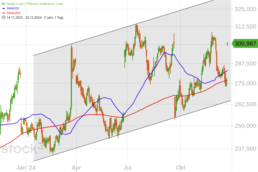 Wegen dieser Pläne nahmen die Anleger gestern FedEx eine weitere Prognosesenkung nicht übel. Statt eines bereinigten Gewinns je Aktie von 20 bis 21 $ rechnet FedEx nun für das laufende Geschäftsjahr mit 19 bis 20 $. Diese Anpassung überraschte allerding nicht, hatten Analysten bereits im Vorfeld ihre Erwartungen gesenkt und ohnehin nur noch mit der Mitte der neuen Prognosespanne gerechnet.