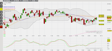 Der Nachdem der DAX seine Aufwärtsbewegung zuletzt nach dem Breakout über den GD20 bis in den Bereich des oberen Bollinger-Bands ausdehnen konnte, hatte der Deutsche Leitindex zuletzt mit Gewinnmitnahmen zu kämpfen. Die Tatsache, dass der DAX am gestrigen Dienstag mit einem Aufschlag von +0,3% auf Tageshoch aus dem Handel gehen konnte, belegt jedoch, dass die Bullen zumindest kurzfristig die besseren Karten haben dürften. Untermauert wird diese These durch die weiter bestehenden Kaufsignale des GD200 und des GD20 sowie dem Long-Signal in der Slow-Stochastik.