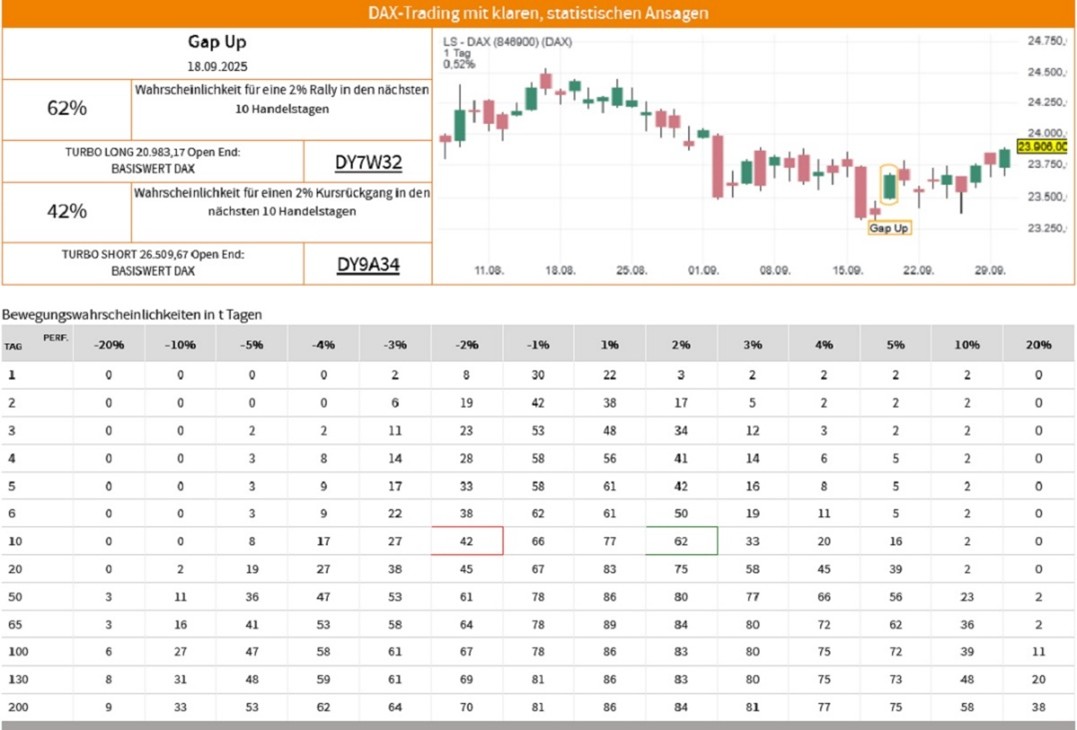 Die Erfolgswahrscheinlichkeiten für das Signal "Gap Up" beruhen auf einer historischen Auswertung des Signals auf den LS-DAX im Zeitraum vom 02.01.2000 bis zum 30.09.2025. Dabei wurden die folgenden Voreinstellungen und Filter vorgenommen: