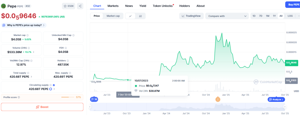Im Oktober 2023 notierte Pepe (PEPE) noch bei rund 0,0000007247 US-Dollar. Heute, zwei Jahre später, liegt der Kurs laut CoinGecko bei etwa 0,000009635 US-Dollar. Damit hätte sich eine Investition von 1.000 US-Dollar auf fast 13.300 US-Dollar vergrößert.