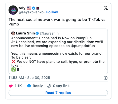 Ein Faktor für die starke Entwicklung von Pump.fun könnte auch der Kommentar des Solana-Gründers Anatoly Yakovenko sein. Denn dieser äußerte, dass die Livestreaming-Funktion der Plattform möglicherweise ein Konkurrent für TikTok werden könnte.