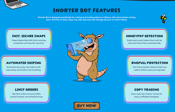 Snorter stellt mit seinem Erdferkel-Maskottchen, welches die vielversprechendsten Coins aus der Flut täglich neu erscheinender Kryptowährungen aufspürt, zudem ein ganz besonderes Tier im Memecoin-Sektor dar.