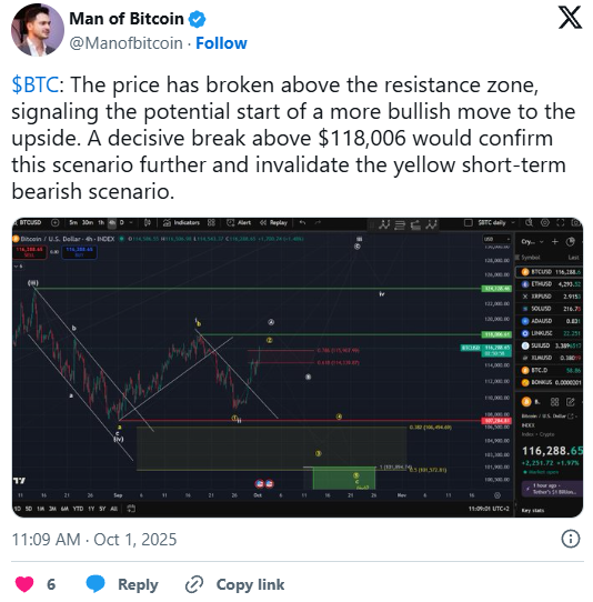 Bitcoin ist kürzlich über eine bedeutende Widerstandszone ausgebrochen, ein Schritt, den die meisten Analysten als möglichen Beginn eines längerfristigen bullischen Trends bewerten. Ein sauberer Ausbruch über 118.006 US-Dollar würde gemäß kurzfristiger Charts diese bullische Perspektive noch weiter stärken. Dies würde nicht nur die strukturelle Stärke der führenden Kryptowährung bestätigen, sondern auch bärische Strukturen umkehren, die in früheren Handelssitzungen mögliche Rücksetzer angedeutet hatten.