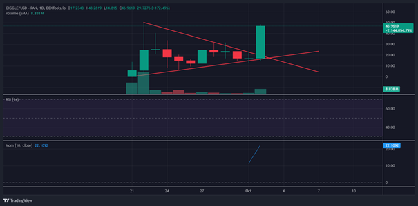 Allerdings können sie möglicherweise nicht dieselbe Viralität wie ein Memecoin erlangen. Sollte GIGGLE diese Bewertungen erreichen, ergäbe sich basierend auf der Marktkapitalisierung ein Steigerungspotenzial von 1.093 bis 3.567 %. Derzeit profitiert der Coin auch von dem bullischen Uptober sowie dem steigenden Krypto- und Aktienmarkt.
