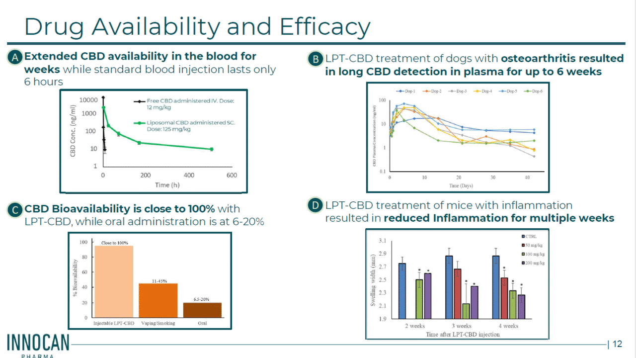 Einige der präsentierten Grafiken werden Fans von InnoCan Pharma* (WKN: A41FTP) bereits bekannt sein. Oral eingenommenes CBD wird aufgrund des hohen First-Pass-Metabolismus in der Leber stark abgebaut, was zu einer geringen systemischen Verfügbarkeit von typischerweise nur 6-25% führt. Diese geringe Bioverfügbarkeit erfordert eine hohe orale Dosierung, um therapeutische Effekte zu erzielen. LPT-CBD hingegen umgeht den First-Pass-Leberstoffwechsel, wodurch eine nahezu 100-prozentige CBD-Verfügbarkeit im Blutkreislauf erreicht und therapeutische Werte bis zu sechs Wochen lang aufrechterhalten werden. Eine einzige subkutane Injektion von LPT-CBD hat in mehreren präklinischen Studien verlängerte CBD-Konzentrationen im Blut gezeigt, ohne dass bisher signifikante Nebenwirkungen berichtet wurden. Neue Daten zeigen insbesondere, dass CBD in einem Entzündungsmodell an Mäusen die Entzündung deutlich dosisabhängig reduzierte und die Wirkung vier Wochen lang anhielt.