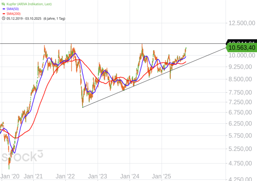 Der Kupfermarkt erlebt derzeit eine Zuspitzung auf der Angebotsseite, was die Preise auch heute weiter anziehen lässt. Kommt nun der große Ausbruch? Zwei Großproduzenten fallen erheblich zurück. Freeport-McMoRan musste nach einem Schlammstrom-Unfall die Förderung in der indonesischen Grasberg-Mine drastisch drosseln und rechnet erst 2027 wieder mit voller Kapazität. Für 2026 senkte der Konzern seine Absatzprognose bereits um 35 %. Auch in Chile kam es zu einem massiven Rückgang. Die staatliche Codelco, weltweit größter Produzent, meldete im August ein Produktionsminus von knapp 10 % im Jahresvergleich. Es ist der der stärkste Rückgang seit 2023. Ursache war ein Erdbeben Ende Juli, das den Betrieb und die Verhüttung in El Teniente lahmlegte. Die Kupfernachfrage wird in den nächsten Jahren aufgrund des massiven Ausbaus der Stromnetze und Data Center einen neuen Schub erhalten.