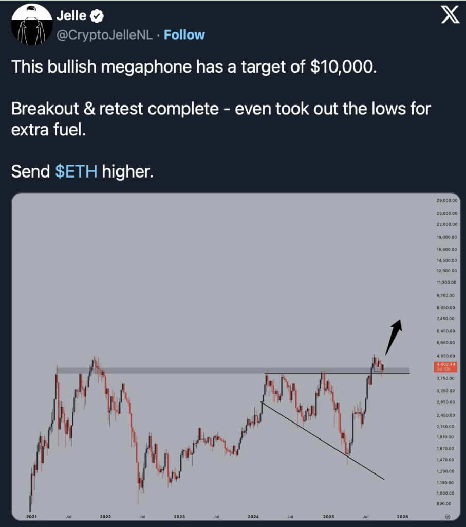 Wie stark der ETH-Kurs in den kommenden Wochen und Monaten tatsächlich ansteigen wird, lässt sich nur schwer sagen und dürfte unter anderem von den politischen und regulatorischen Veränderungen in den USA abhängen. Eine langfristige Prognose wagt hingegen der Krypto-Analyst "CryptoJelleNL" über die Social-Media-Plattform X.