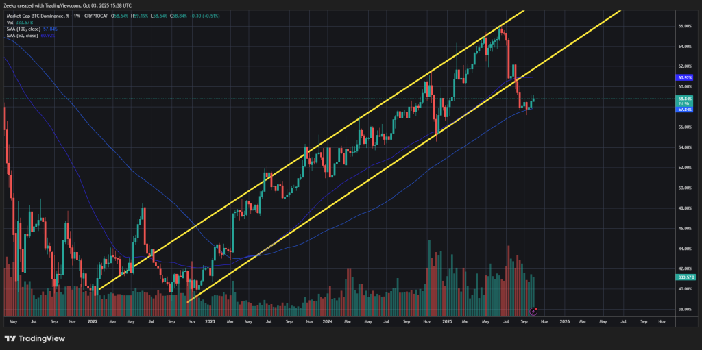 Die Stärke von Altcoins bedeutet nicht zwangsläufig eine Schwäche von Bitcoin. Bitcoin kann weiter steigen, auch wenn Altcoins es outperformen und die Bitcoin-Dominanz dadurch schrumpft. Die technische Analyse zeigt, dass Bitcoin trotz eines Dominanzrückgangs von 65,8% auf 57,8% robust bleibt, gestützt durch Rebounds am 50-Wochen-Durchschnitt (60,7%) und 100-Wochen-Durchschnitt (57,8%). Diese Unterstützungen deuten auf eine stabile Basis für weitere Kurssteigerungen hin.