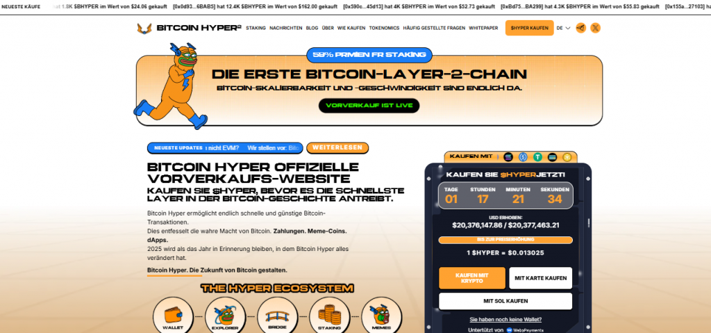 Presales bleiben auch 2025 für spekulative Anleger attraktiv, da sie Zugang zu Projekten im frühen Stadium eröffnen. Der Oktober 2025 markiert eine Phase, in der der Kryptomarkt stärker tendiert. Während Bitcoin erneut sein Allzeithoch testet, sorgt auch ein Projekt aus dem Ökosystem für Schlagzeilen: Bitcoin Hyper (HYPER). Die neue Layer-2-Lösung soll der ältesten Blockchain zu mehr Flexibilität verhelfen und den Grundstein für ein breiteres Ökosystem legen.