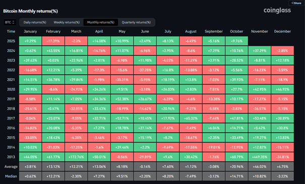 Durchschnittliche Bitcoin-Kursentwicklung pro Monat | Quelle: CoinGlass