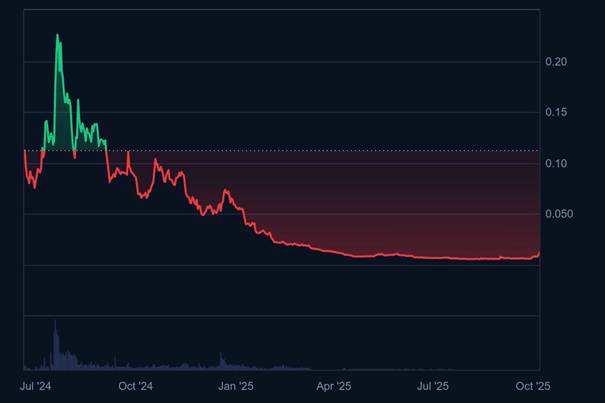 Nach der initialen Rally von 0,112 USD auf das Allzeithoch von 0,2396 USD um 113,93 %, ist der Coin schnell wieder aus dem Fokus der Investoren geraten und endete in der Bedeutungslosigkeit, als er bis auf 0,005049 USD um 97,89 % an Wert verlor.
