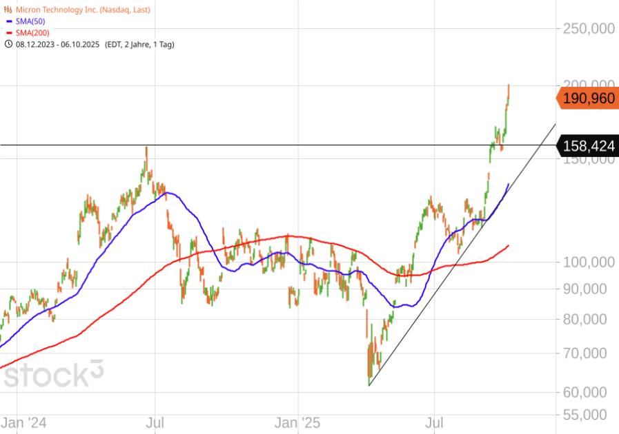Micron bekommt frischen Schub von der Analystenseite: Morgan Stanley stuft die Aktie von Equal-Weight auf Overweight hoch und hebt das Kursziel auf 220 $ an. Der zuständige Analyst Joseph Moore begründet den Schritt mit einer klar positiven Preisentwicklung bei Speicherchips. Sowohl DRAM (Dynamic Random Access Memory) als auch NAND (Flash-Speicher) zeigen stark steigende Preise, und die Nachfrage bleibt bis mindestens 2026 hoch, getrieben von Servern, KI-Rechenzentren und Storage-Lösungen. Käufer seien zunehmend nervös, ob überhaupt genügend Kapazitäten verfügbar sind. Micron steht vor mehreren Quartalen mit zweistelligen Preissteigerungen, welche die Gewinnkraft substantiell nach oben treiben sollten. Also: Zyklische Erholung am Speicherchipmarkt + struktureller KI-Boom. Bitte zunächst bis Jahresende ausreizen.