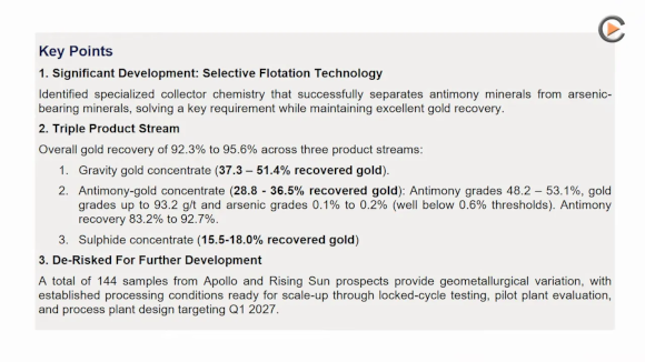 - 30-40% des Goldes berichten in ein Gold-Antimon-Konzentrat - hochwertig, wenn Arsengehalte niedrig gehalten werden (die Firma berichtet von 0.1-0.2% As in Tests).