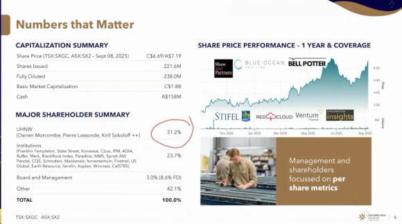 Southern Cross nennt prominente Investoren im Aktionärsregister - darunter Darren Morcombe, Pierre Lassonde und Kirill Sokoloff - die zusammen rund 30% halten. Ein erfahrener Anlegerblock signalisiert Glauben an das technische Konzept und diszipliniertes Management. Gleichzeitig bewegt sich das Unternehmen vom reinen Explorer zum Entwickler: lokales Teamaufbau, Community-Arbeit und schrittweise Hinführung zu Ingenieursstudien werden betont.