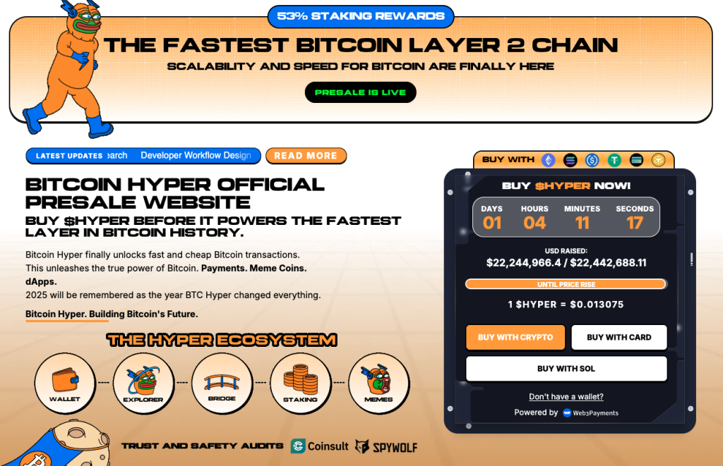 Die steht derzeit schließlich noch vor dem ersten Börsen-Listing. Anleger können hier gerade noch im Vorverkauf einsteigen und sich HYPER zu einem rabattierten Presale-Preis von 0,013075 $ sichern. So kam bis jetzt schon deutlich über 22 Millionen $ an Funding von interessierten Investoren zusammen. Immer mehr Anleger sind bereit, die mit einem Presale-Kauf einhergehenden Risiken auf sich zu nehmen, um bei Bitcoin Hyper zu partizipieren.