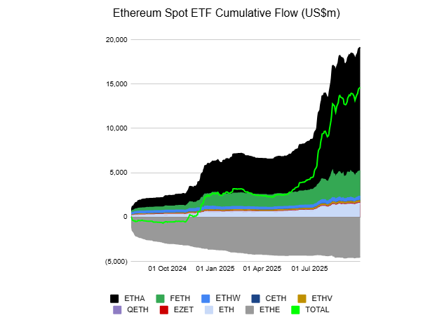 Auch ETFs bleiben im Aufwärtstrend, Quelle: https://farside.co.uk/eth/