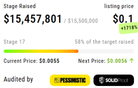 Bisher hat er bereits die Hälfte dieses Weges geschafft: über 15 Millionen US-Dollar wurden eingesammelt, und der Token steht derzeit bei $0,0055.