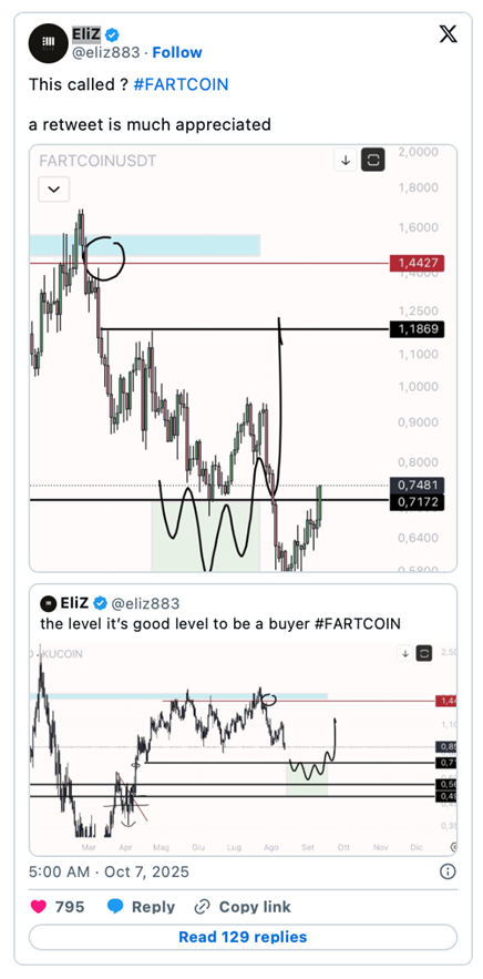 Der Krypto-Analyst EliZ hat auf X kürzlich auf ein technisches Chart-Setup von Fartcoin verwiesen, welches die Formation doppelter Boden zeigt, die wiederum auf eine bullische Umkehr hindeutet.