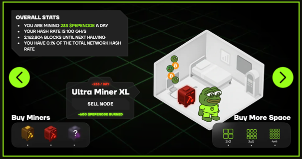 Mit dem nativen PEPENODE-Coin kann Mining-Hardware erworben werden, wobei die Nodes einzigartige Eigenschaften erhalten. Anschließend können sie in den Serverräumen angeordnet werden, um optimierte Mining-Rigs für Memecoins zu bilden.