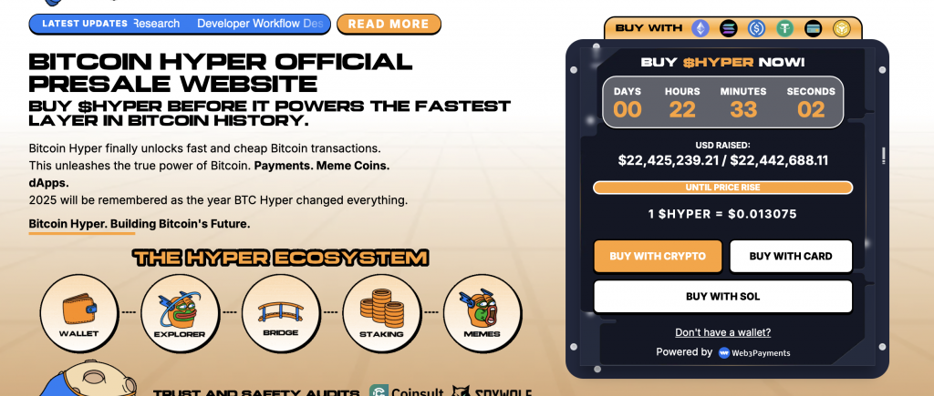 Die Stärke von Bitcoin Hyper liegt in seiner Parallelverarbeitung. Während traditionelle Blockchains Transaktionen nacheinander abwickeln, erlaubt das SVM-Framework mehrere gleichzeitige Prozesse. Der aktuelle Presale hat bereits über 22 Millionen US-Dollar eingesammelt, was ein klarer Hinweis auf das wachsende Vertrauen in dieses Modell ist. Der HYPER Token kann mit SOL, ETH, USDT, USDC, BNB oder Kreditkarte erworben werden und ermöglicht Staking mit rund 55 Prozent jährlicher Rendite.