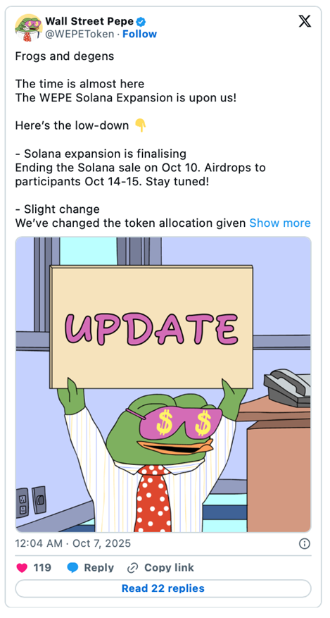 Während der Frühphase lag der Preis für einen WEPE auf Solana bei 0,001 USD. Allerdings wurden dabei keine neue Coins emittiert, sondern basierend auf dem Kaufpreis die entsprechende Anzahl WEPE auf Ethereum verbrannt.