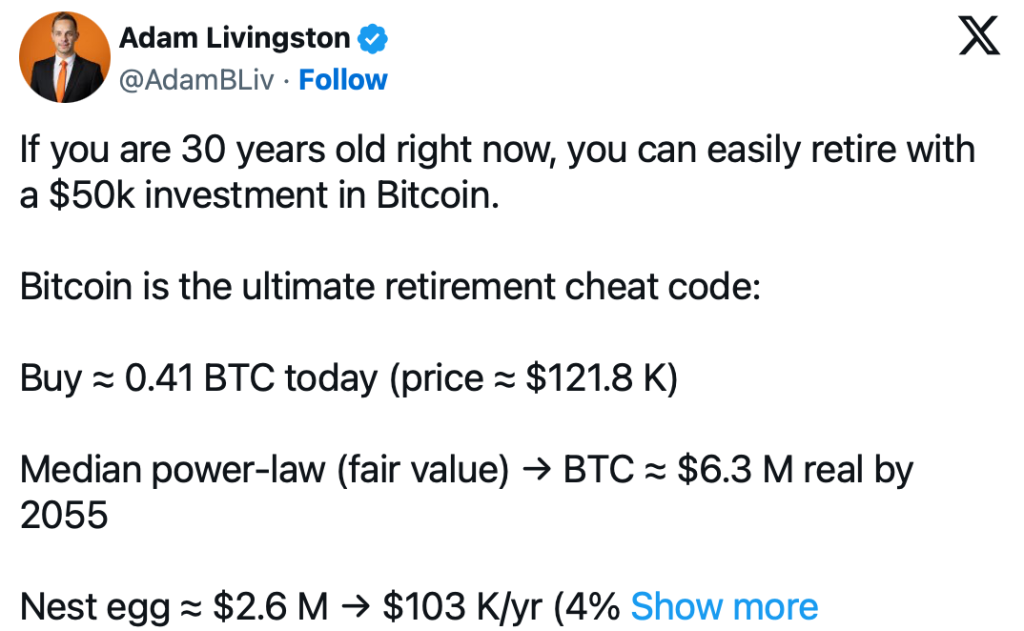 Der Finanzanalyst Adam Livingston argumentiert, dass ein 30-Jähriger mit einer einmaligen Investition von 50.000 US-Dollar in Bitcoin theoretisch finanziell abgesichert in den Ruhestand gehen könnte. Grundlage seiner Berechnung ist ein langfristiges Modell, das Bitcoin anhand des sogenannten Power-Law-Wachstums bewertet - einer logarithmischen Entwicklung, bei der Wertsteigerung und Zeit exponentiell zusammenwirken. Livingston kalkuliert, dass 0,41 BTC bei einem heutigen Kurs von rund 121.800 Dollar langfristig einen realen Wert von etwa 6,3 Millionen US-Dollar erreichen könnten.