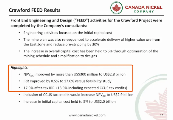 Canada Nickel (ISIN CA13515Q1037 WKN A2P0XC) hat eine Bankable Feasibility Study (BFS) vorgelegt und den nächsten Schritt, das Front-End Engineering Design (FEED), abgeschlossen. Als Engineering-Partner fungierte Asenko (Asenko hat Erfahrung mit Bau und Betrieb großer Tagebau- und Verarbeitungsanlagen). FEED erlaubt das Bestellen von Long-Lead-Items und ist ein klassischer Meilenstein vor einer Baubeschlussfassung.