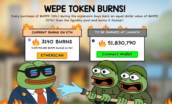 Die Investoren trugen zur Expansion auf Solana bei, was durch die Käufe geschah, welche WEPE-Token automatisch zu einem Preis von 0,001 USD verbrannt haben, der dem US-Dollarwert der Transaktion zum Zeitpunkt des Kaufs basierend auf dem aktuellen Marktpreis von WEPE entsprach.