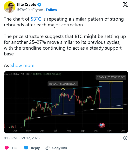 Aus technischer Sicht scheint Bitcoin nach jeder großen Korrektur eine Art zyklische Erholung gebildet zu haben. Der Zyklus war im Jahr 2025 deutlicher zu beobachten, da die Kryptowährung die Trends der Vorjahre wiederholte, sich konsolidierte und dann neue Höchststände erreichte. Eine klare Struktur im Chart zeigt eine starke Trendlinie als gute Unterstützung, die selbst bei den neuesten Erschütterungen von Bitcoin standhält.