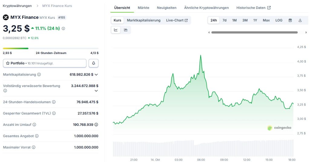 MYX Finance (MYX) sorgt aktuell für Bewegung im Altcoin-Sektor. Der DeFi-Token verzeichnete innerhalb der letzten 24 Stunden ein Plus von rund +11 % - und das in einem Markt, der insgesamt eher schwächelt. Während viele große Coins wie Bitcoin und Ethereum leichte Verluste hinnehmen mussten, zeigt MYX eine bemerkenswerte Gegenbewegung. Der Aufschwung spiegelt wider, dass Investoren vermehrt nach Projekten mit realer Anwendung und aktivem Ökosystem suchen.