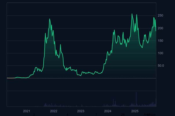 Darüber hinaus konnte Solana mittlerweile Ethereum bei der Anzahl der Entwickler überholen, wobei es laut dem Solana Ecosystem Report H1 2025 von Helius 7.600 neue Programmierer sind, während die Ethereum-Entwickler nur 6.244 zählen. Sollte SOL dieselbe Marktkapitalisierung wie ETH auf seinem Allzeithoch von 571,67 Mrd. USD erreichen, würde dies basierend auf der aktuellen Bewertung von 113,38 Mrd. einer Rendite von 5,04x und einem SOL-Kurs von 1.046 USD entsprechen. Jedoch sollten in diesem Bullenmarkt mindestens zwischen 400 und 500 USD gesehen werden.
