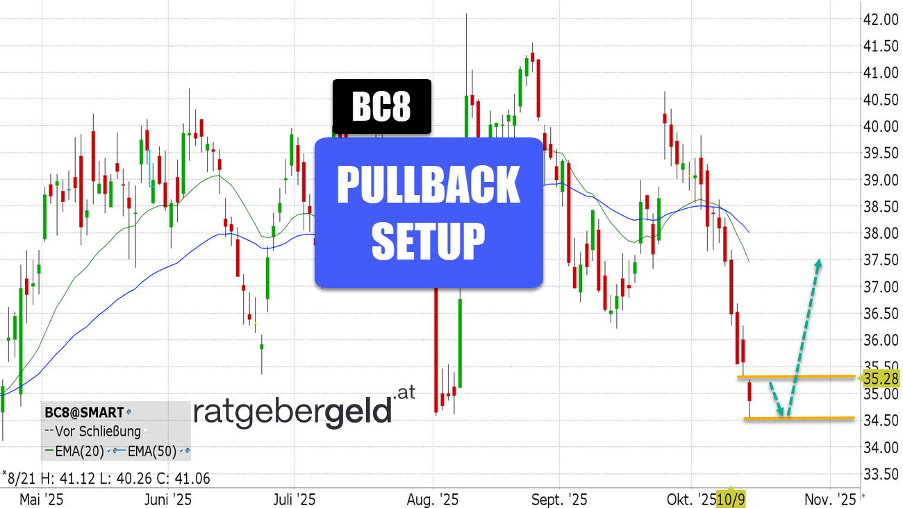 Rückblick: Der Blick auf das Chartbild zeigt die Bechtle-Aktie in einer übergeordneten Seitwärtsbewegung. Mit der Tageskerze vom heutigen Dienstag hat das Wertpapier das Pivot-Tief vom August kurzfristig unterschritten. Zurück bleibt eine Kurslücke von 8 Cent gegenüber der Montagskerze.