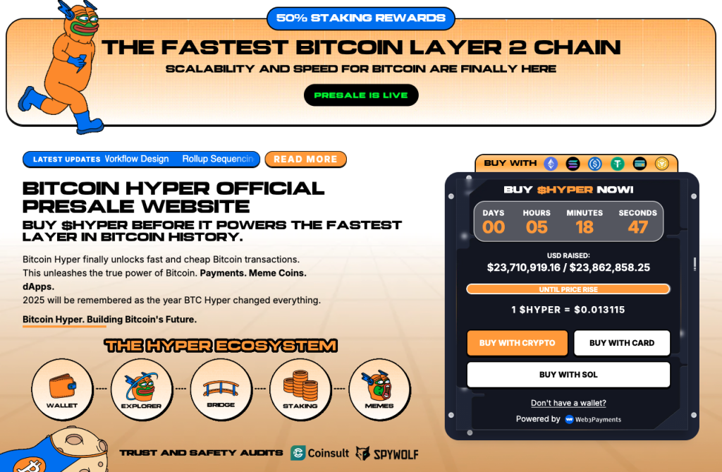 Der Erwerb von HYPER ist aktuell ausschließlich über das Presale-Widget auf der offiziellen Website des dahinterstehenden Projektes Bitcoin Hyper möglich. Hier kann derzeit noch zu einem rabattierten Festpreis von 0,013115 $ investiert werden. Die Summe des Presale-Fundings beläuft sich dabei schon auf 23,7 Millionen $. Das macht Bitcoin Hyper zu einem der erfolgreichsten Presales des Jahres und zeigt das große Interesse, das Anleger an dieser jungen Kryptowährung haben.
