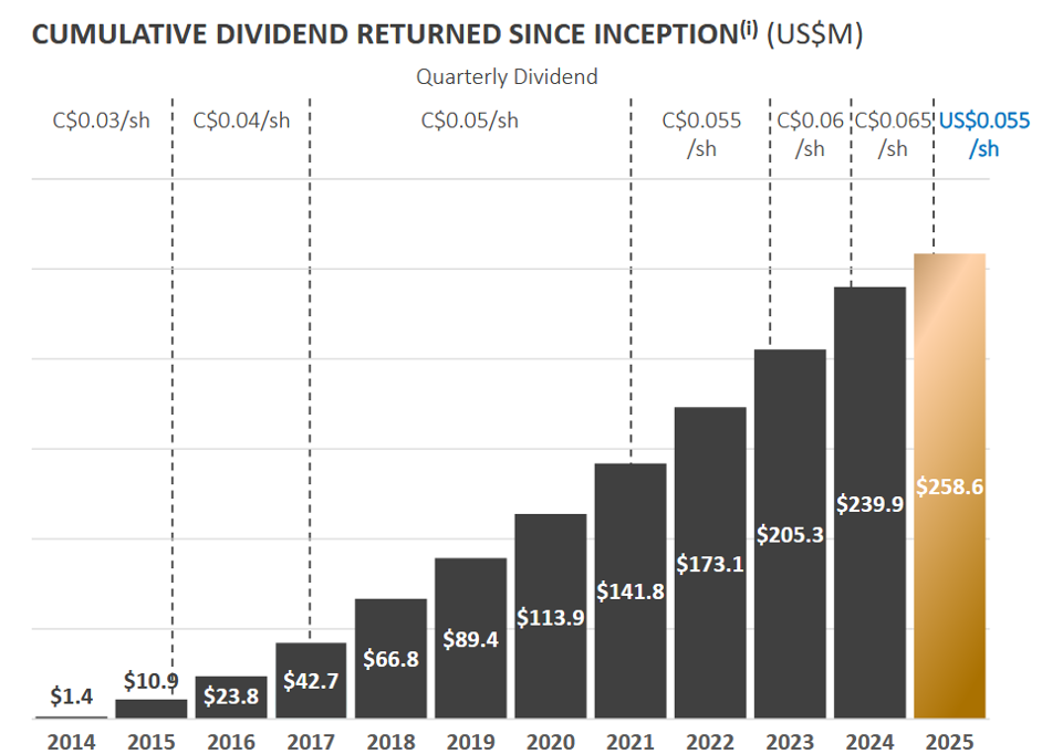 Mit der Zustimmung der Aktionäre Anfang Mai dieses Jahres zur Umfirmierung von vormals Osisko Gold Royalties zu OR Royalties (WKN: A417BX), konnte der Stream-Spezialist auch ganz offiziell die nächste Turbo-Transformationsphase einläuten. Nicht unbedingt zur Feier dieses besonderen Anlasses, dennoch aber zur Freude der Investoren, verkündete OR Royalties eine gleich 20%-ige Steigerung der vierteljährlichen Dividende, die zum 15. Juli 2025 bei satten 0,055 USD/Aktie lag.