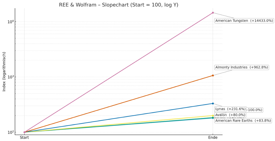 Noch viel gewaltiger ging es bei Wolfram-Aktien ab! Hier hat sich beispielsweise American Tungsten um über 14.000% und Almonty Industries um fast 1.000% verteuert.