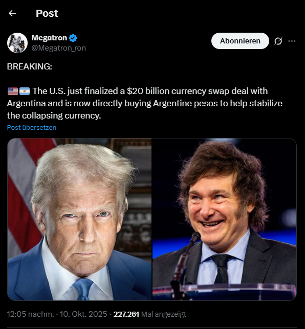 Darüber hinaus wurde ein Währungsswap mit Argentinien vereinbart, welches über Reserven seltener Erden verfügt und zuletzt China in dieser Hinsicht Möglichkeiten geboten hatte. Somit sollte laut Experten die Macht des US-Dollars ausgebaut und ein Zugriff auf die seltenen Erden ermöglicht werden.