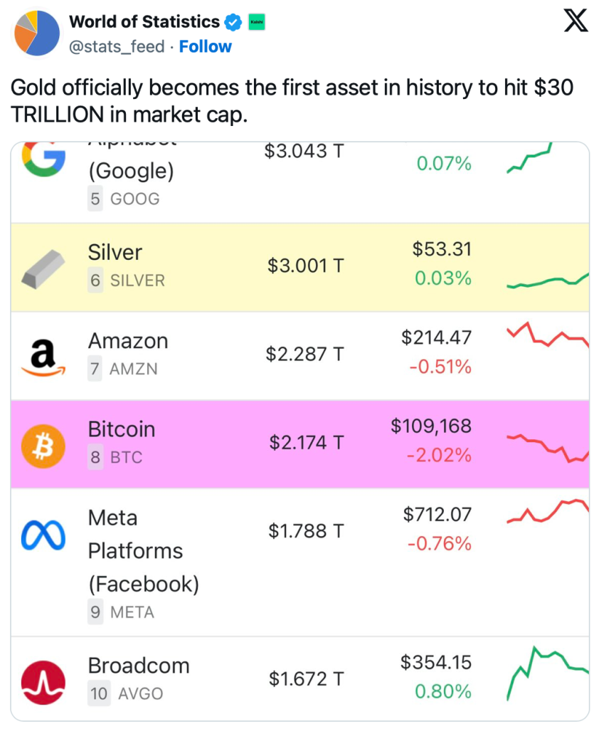 Gold hat gestern als erstes Asset überhaupt die 30-Billionen-Dollar-Marke geknackt und damit seine Dominanz am Finanzmarkt eindrucksvoll unter Beweis gestellt. Im Vergleich dazu erreicht Bitcoin trotz seines spektakulären Anstiegs auf 100.000 Dollar lediglich eine Marktkapitalisierung von 2 Billionen Dollar.