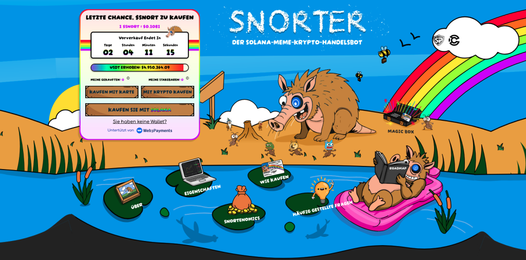 Der Kurs pro Coin beläuft sich auf 0,1081 $ und die im Vorverkauf erworbenen Coins können im Anschluss für eine jährliche Rendite von bis zu 106 % gestakt werden. Das Besondere: Der Presale endet in circa 2 Tagen. Ein weiterer Kaufgrund dürfte der eigene Telegram-Trading-Bot namens SnorterBot sein, der etablierten Größen wie BonkBot und BananaGun Konkurrenz machen soll. Im Gegensatz zu diesen baut er auf der Solana Virtual Machine auf, wodurch Trades für nur 0,85 % Gebühren in unter einer Sekunde abgewickelt werden können.