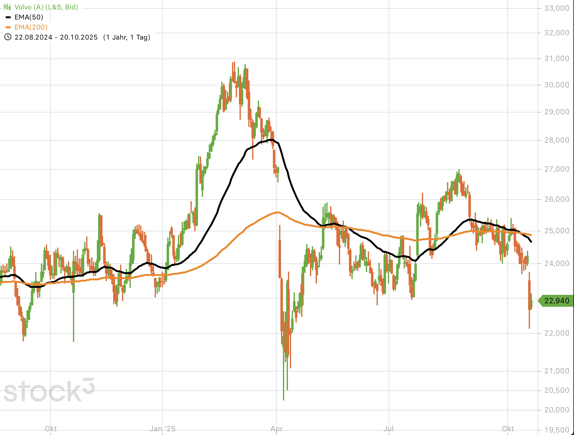 Der schwedische Lkw-Hersteller wies am Freitag wegen der US-Zölle für das dritte Quartal teils deutliche Rückgänge bei Umsatz und Gewinn aus. Der Umsatz fiel gegenüber dem Vorjahresquartal um 5 % auf 110,7 Mrd. SEK. Der um Sondereffekte bereinigte operative Gewinn reduzierte sich auf 11,7 Mrd. SEK (Vorjahr: 14,1 Mrd. SEK) und die entsprechende Marge sank um 1,4 Prozentpunkte auf 10,6 %. Unter dem Strich sank der Gewinn auf 7,54 Mrd. SEK, nach 10,02 Mrd. SEK im Vorjahreszeitraum. Der Auftragseingang sank um 14 % auf insgesamt 37.134 Lkw. Das Management erwartet, dass die US-Zollpolitik die Nachfrage in Nordamerika auch im kommenden Jahr belasten wird und prognostiziert für 2026 einen Rückgang der Lkw-Auslieferungen in Nordamerika um 15.000 Einheiten auf 250.000. Die Volvo-Aktie gab am Freitag um über 8 % nach.