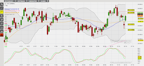 Der DAX konnte am 09. Oktober ein Allzeithoch bei 24.775 Punkten im überkauften Bereich über dem oberen Bollinger-Band ausbilden. Anschließend setzte eine technische Gegenreaktion in Richtung der Support-Zone des GD 20 und GD 50 ein, welche am 14. Oktober im ersten Anlauf noch verteidigt werden konnte. Im zweiten Anlauf wurde die Kursregion dann allerdings am 17. Oktober nach einem Gap-Down auf Schlusskursbasis unterboten. Am 20. Oktober konnte der Index wiederum beide gleitenden Durchschnitte auf Schlusskursbasis zurück erobern. Derzeit weist somit nur noch die Slow Stochastik ein Verkaufssignal aus, weshalb die Bären eine abwartende Haltung eingenommen haben.